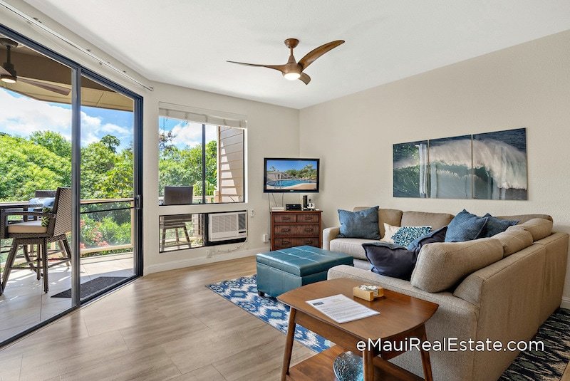 The two-bedroom units have 2 bathrooms that are located on the upper floors of the buildings and are between 1,056 and 1,383 square feet in size. These upper level condominiums units have high, vaulted ceilings and have great views of the golf course and ocean. The one-bedroom floor plan has 2 bathrooms and contains 908 square feet interior and a 161 square foot private lanai.