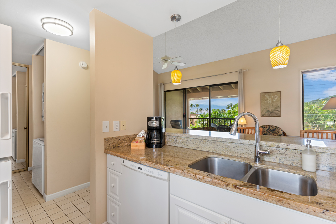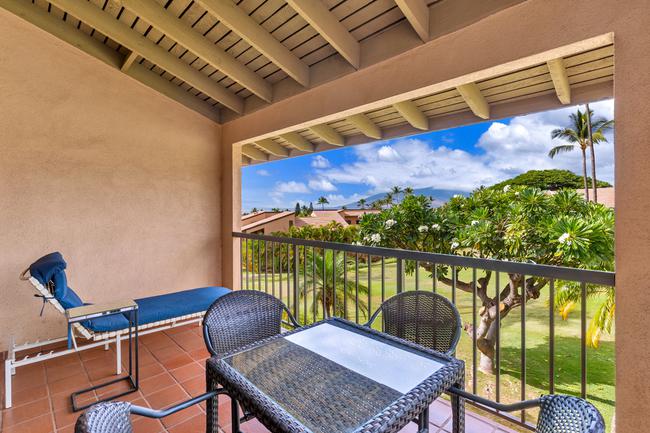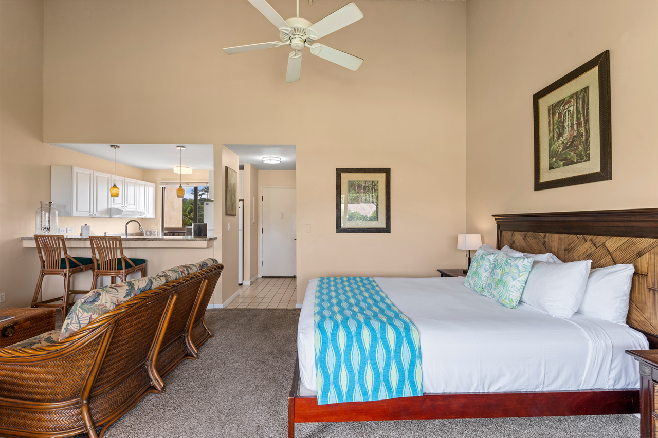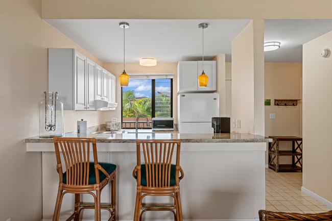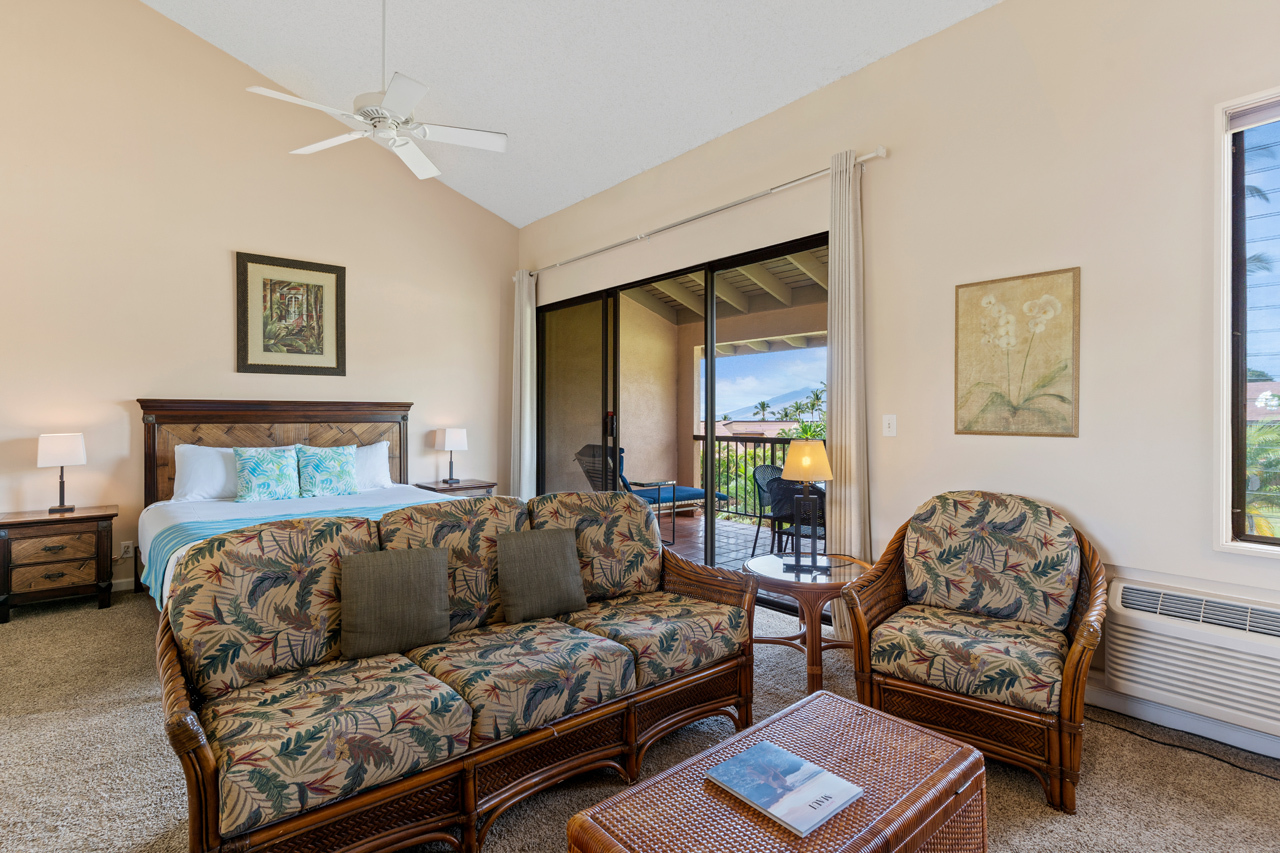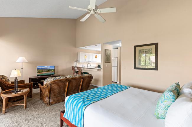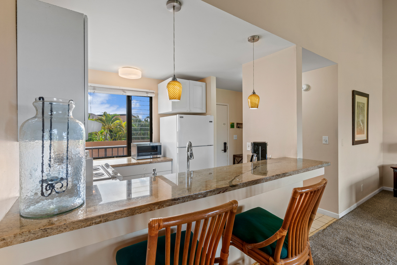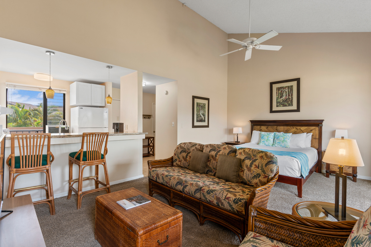 Welcome to Wailea Ekahi 15E, a delightful 484-square-foot studio villa gracefully nestled on the desirable green belt of the community and perfectly positioned for ocean and sunset views. This charming second-floor condo with high vaulted ceilings offers a perfect mix of comfort and island elegance with scenic views of lush, tropical landscaping. Step inside to find a bright, open-concept living space filled with tons of natural light. Large sliding glass doors open up onto a private covered lanai with 116 square feet, ideal for relaxing with a refreshing beverage or savoring an outdoor meal while enjoying the soothing island breezes. The kitchen is well equipped with granite countertops and custom cabinetry stocked with essential cookware, and full-size appliances that make it easy to prepare your favorite island cuisine. Start your morning at the breakfast bar, sipping coffee while planning your perfect Hawaii adventure. Since the king-size bed shares the main living space, you can wake up to breathtaking views right through the sliding glass doors. From the comfort of your bed, watch palm trees sway and fragrant plumeria blossoms drift to the ground. Wailea Ekahi offers world-class amenities, including direct access to Keawakapu Beach, multiple pools, pickleball courts, edible landscaping, and meticulously manicured grounds. This is the epitome of island living at its finest.