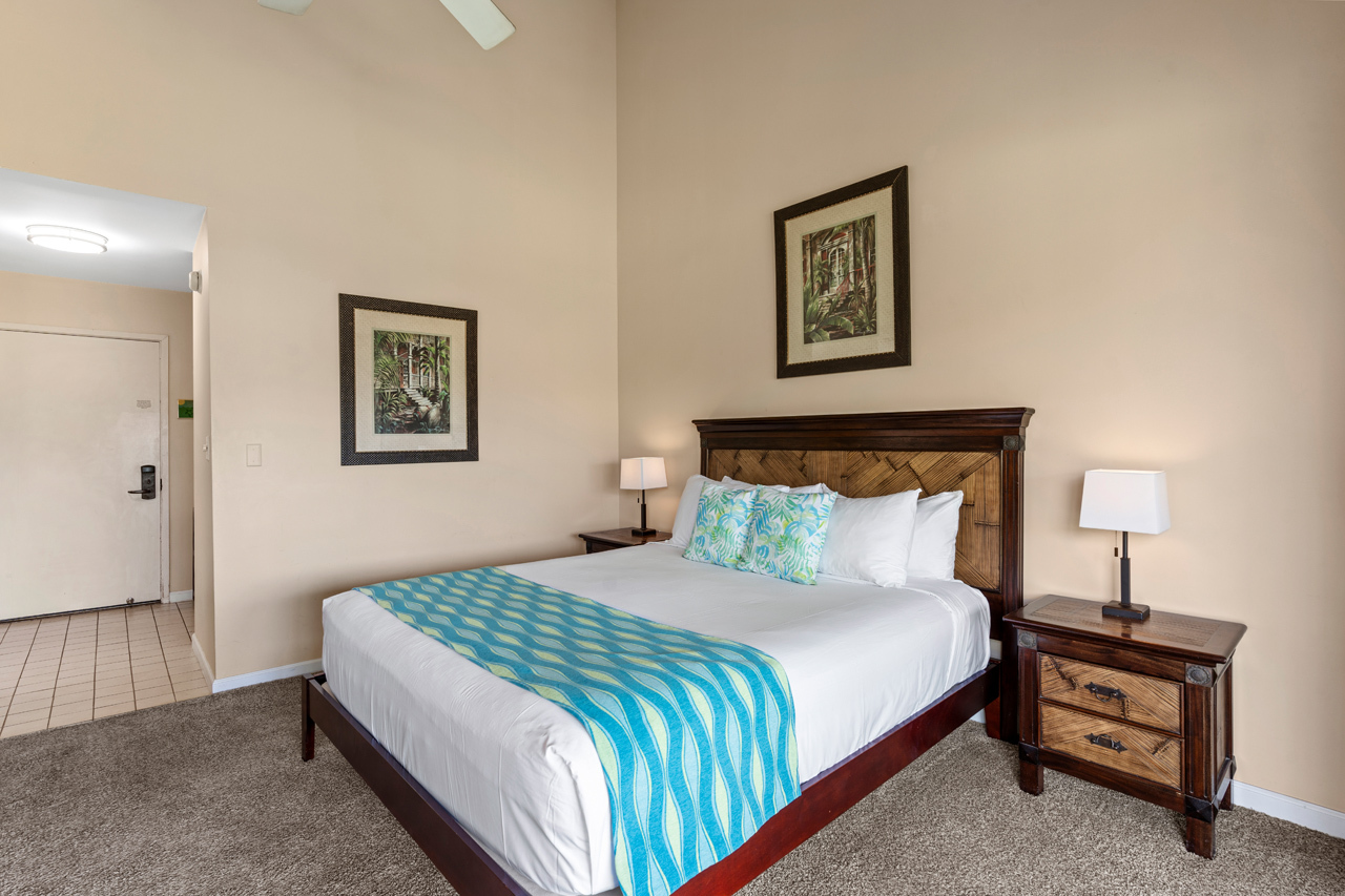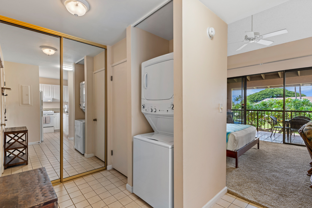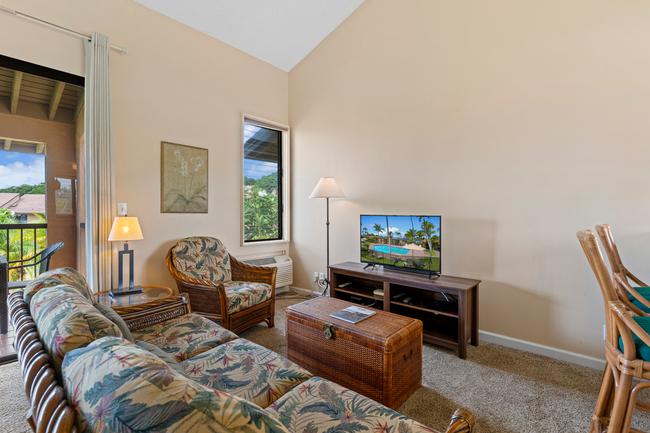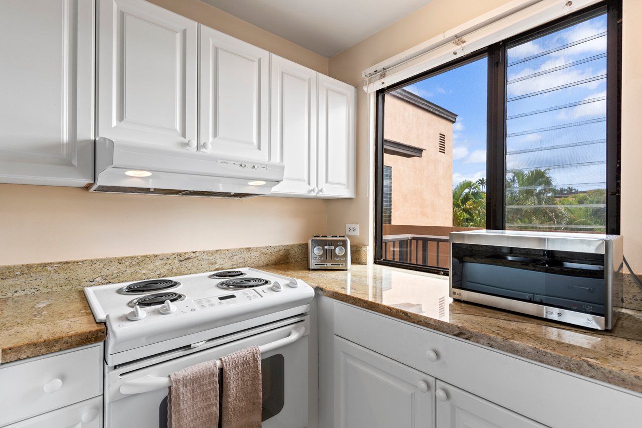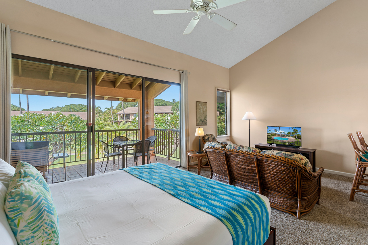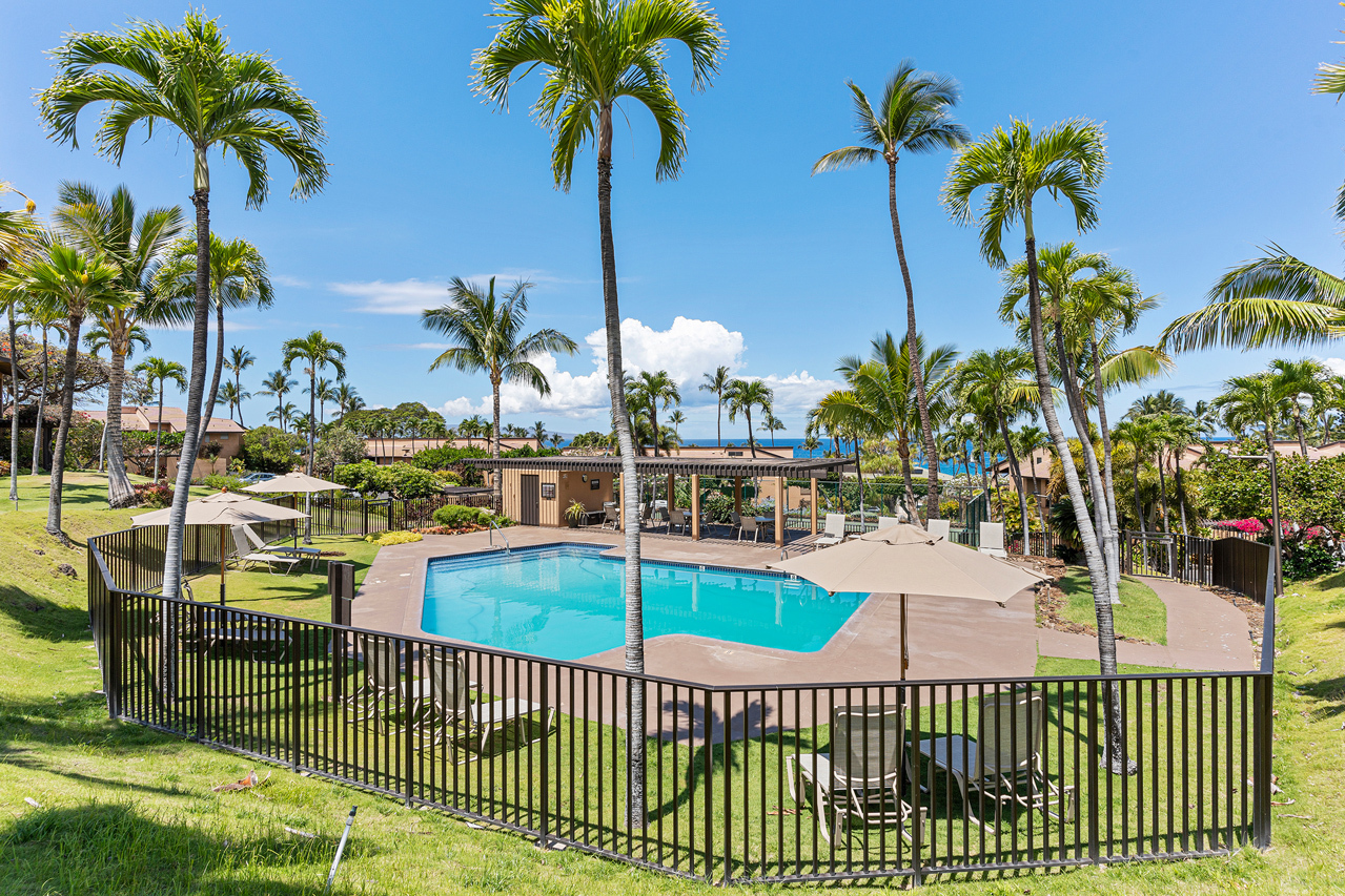 Welcome to Wailea Ekahi 15E, a delightful 484-square-foot studio villa gracefully nestled on the desirable green belt of the community and perfectly positioned for ocean and sunset views. This charming second-floor condo with high vaulted ceilings offers a perfect mix of comfort and island elegance with scenic views of lush, tropical landscaping. Step inside to find a bright, open-concept living space filled with tons of natural light. Large sliding glass doors open up onto a private covered lanai with 116 square feet, ideal for relaxing with a refreshing beverage or savoring an outdoor meal while enjoying the soothing island breezes. The kitchen is well equipped with granite countertops and custom cabinetry stocked with essential cookware, and full-size appliances that make it easy to prepare your favorite island cuisine. Start your morning at the breakfast bar, sipping coffee while planning your perfect Hawaii adventure. Since the king-size bed shares the main living space, you can wake up to breathtaking views right through the sliding glass doors. From the comfort of your bed, watch palm trees sway and fragrant plumeria blossoms drift to the ground. Wailea Ekahi offers world-class amenities, including direct access to Keawakapu Beach, multiple pools, pickleball courts, edible landscaping, and meticulously manicured grounds. This is the epitome of island living at its finest.